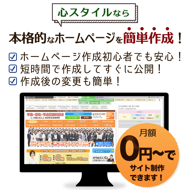 心スタイルの強み一覧はこちら 1 誰でも簡単にホームページを作成! 2 集客力のあるホームページを作成できる! 3 SEO対策を追求! 4 短時間で作成可能! 5 作成後の変更も簡単!心スタイルの強み一覧はこちら